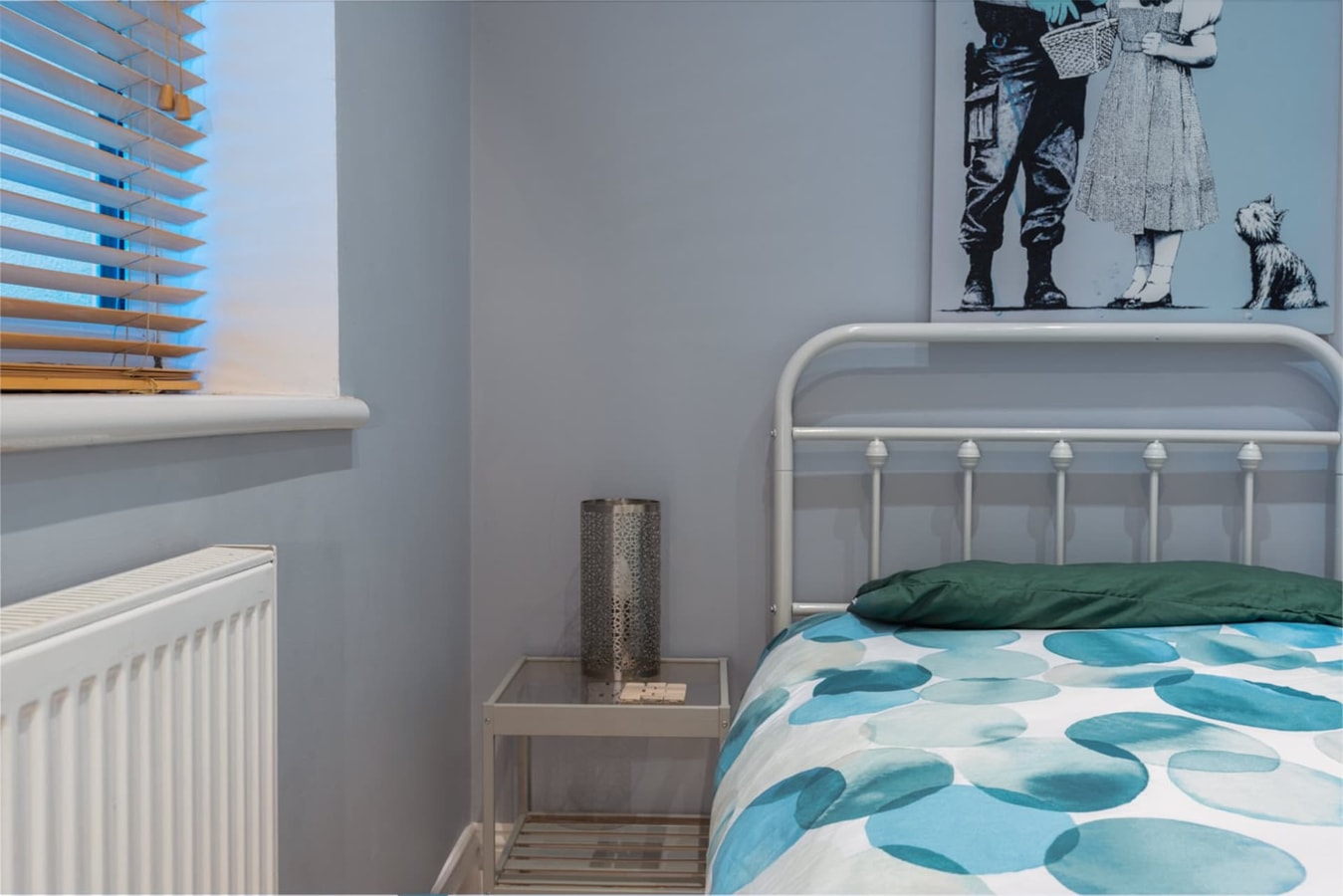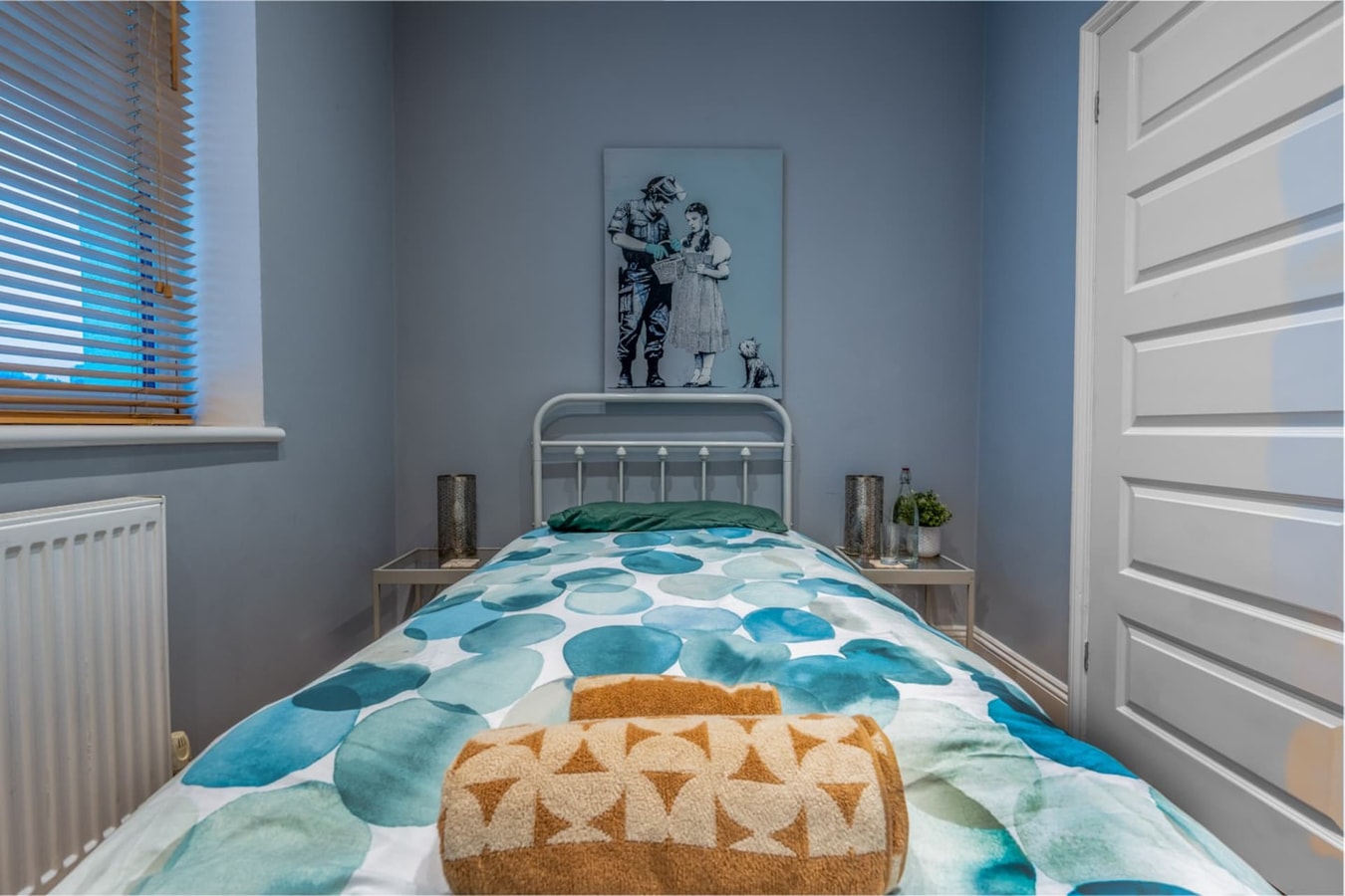 The downstairs bedroom is a peaceful retreat with a comfortable double bed and soothing decor, ensuring a restful sleep. Upstairs, you'll find a cosy single bedroom, ideal for additional guests or as a quiet nook. Both rooms are adorned with plush bedding, combining down and polyester for ultimate comfort.