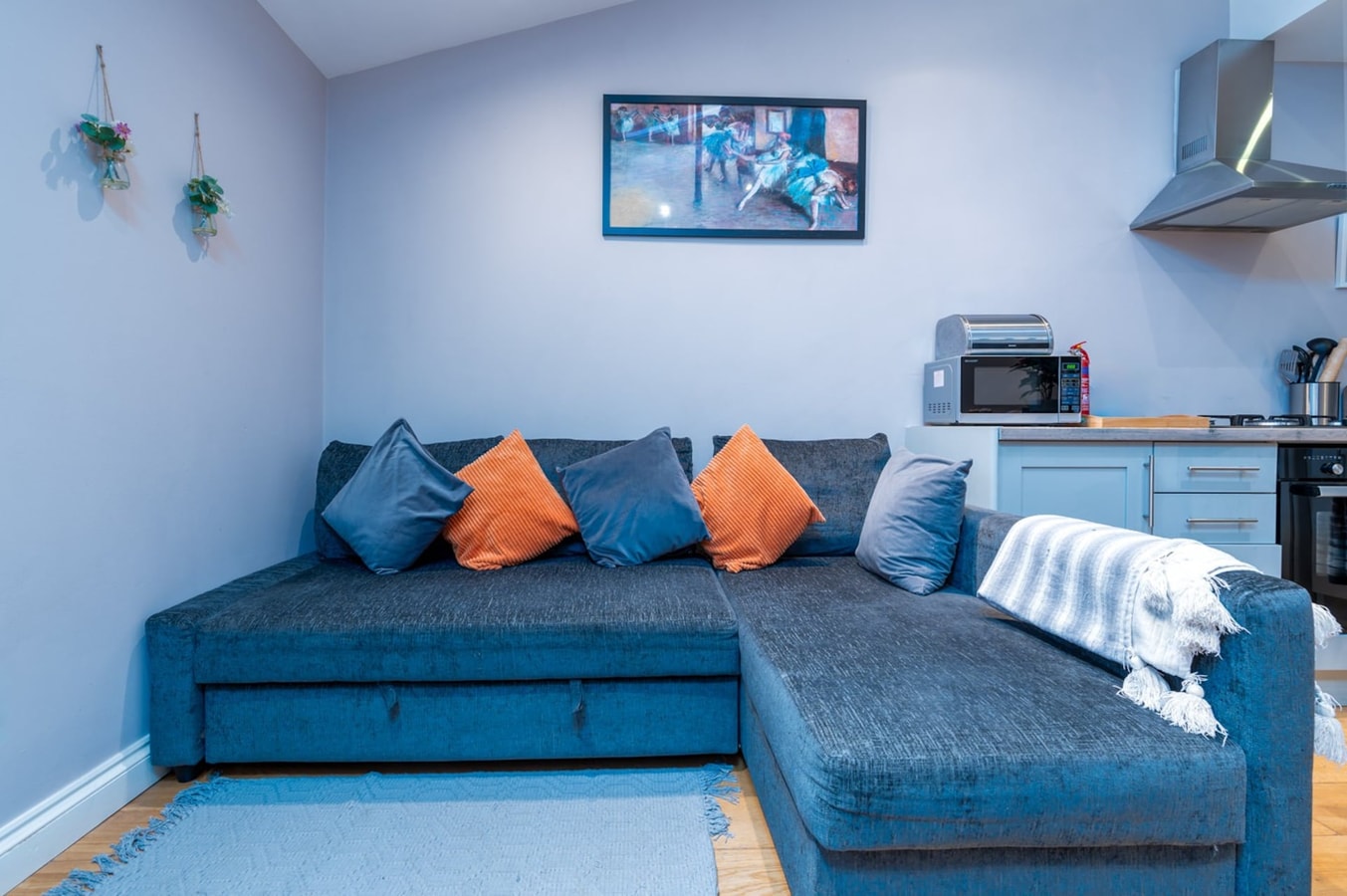 Welcome to our charming flat, where modern amenities meet homely comfort. The heart of the home is the living room, featuring a cosy sofa that transforms into a bed, a smart TV with Chromecast, and tasteful decor creating a relaxing ambiance. The kitchen, adjacent to the living room, is fully equipped with an oven, fridge/freezer, microwave, and kettle - perfect for culinary explorations.